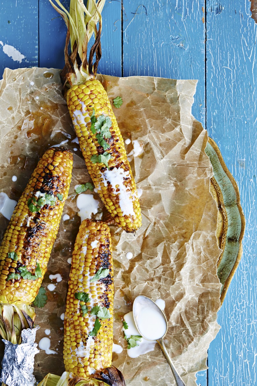 4. Nosta ruskistuneet maissit grillistä vadille. Ripottele päälle korianterin lehdet ja kastike.