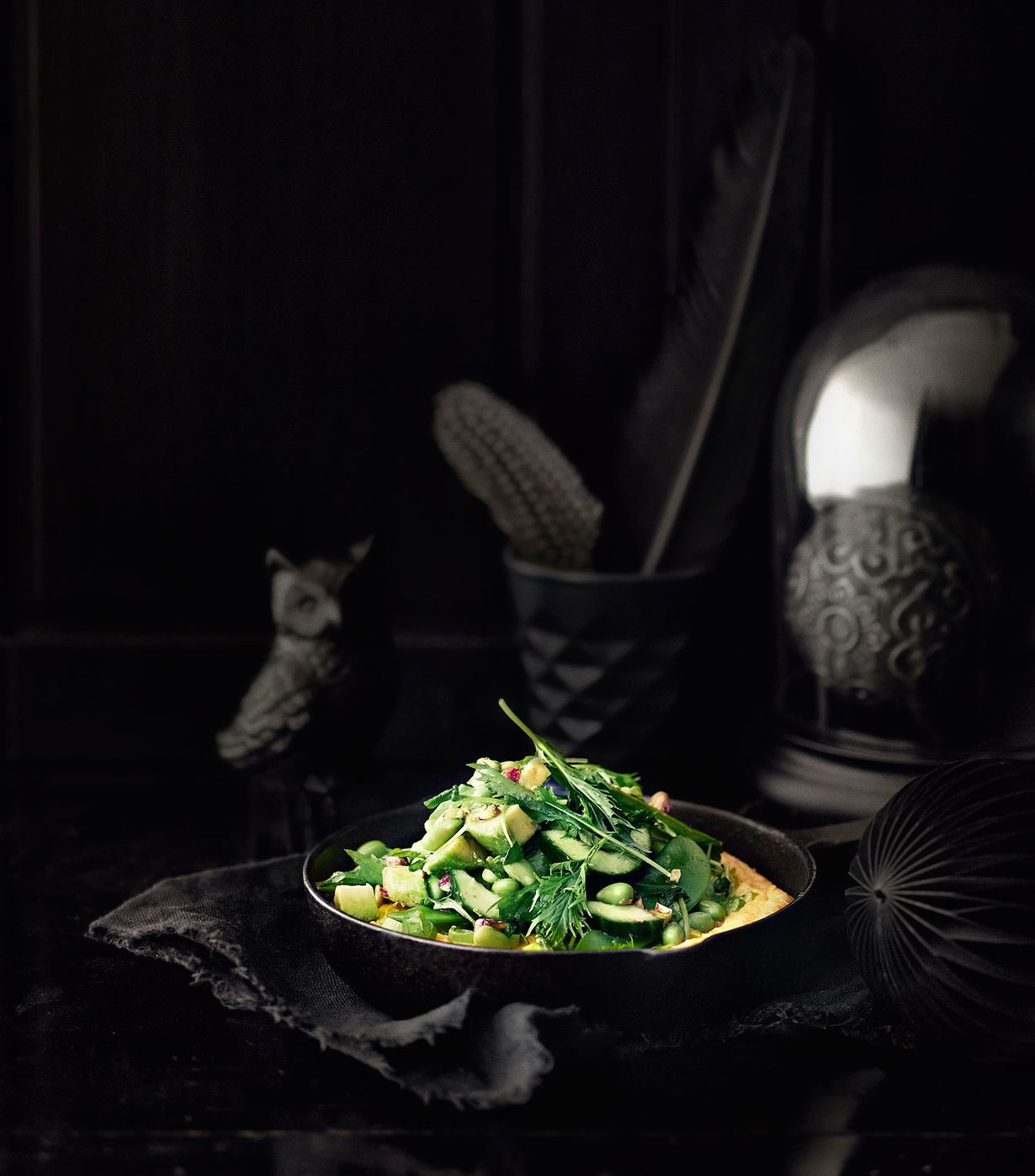 Paista japanilaistyylinen ohut, makea munakas ja kokkaa munakkaan päälle supervihreä salaatti avokadosta, soijapavuista ja pistaasipähkinöistä.