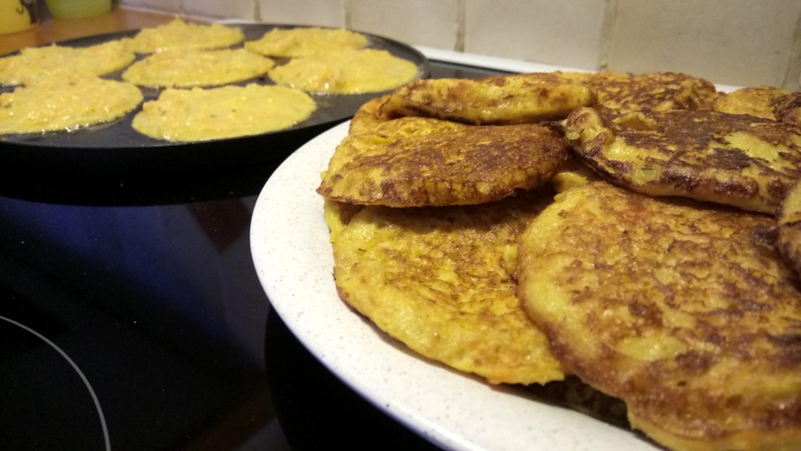 Kuori ja raasta hienoksi palsternakat, porkkanat ja juuriselleri. Paahda raastetta öljyssä pannulla mausteiden kanssa 5 minuuttia. Anna jäähtyä.
