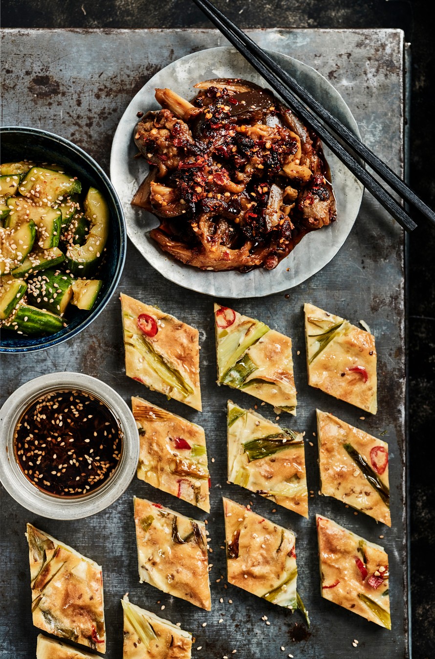 Leikkaa pannukakku jäähtyneenä annospaloiksi ja tarjoa dippikastikkeen, mäiskykurkkujen ja chilimunakoison (ohjeet alla) kanssa.