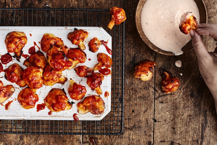 Naposteltavaa syntyy helposti kun paistat kukkakaalipalat uunissa taikinakuoressa ja sivelet pintaan maukasta barbeque-kastikketta. Lopputulos on yhtä koukuttava kun tuliset kananwingsit! Mausteisesta kastikkeesta valmistuu kermaviilin kanssa näppärästi myös herkullinen dippi.