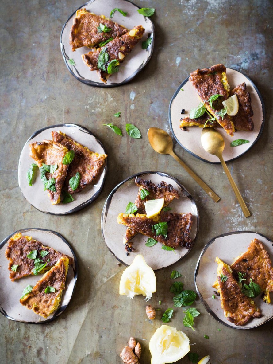 Mausteiksi riittää kurkuma, paprika ja suola. Munakas paistetaan reilussa öljyssä ja leikataan jo pannulla annospaloiksi, jotka on helpompi kääntää ja paistaa toiseltakin puolelta.