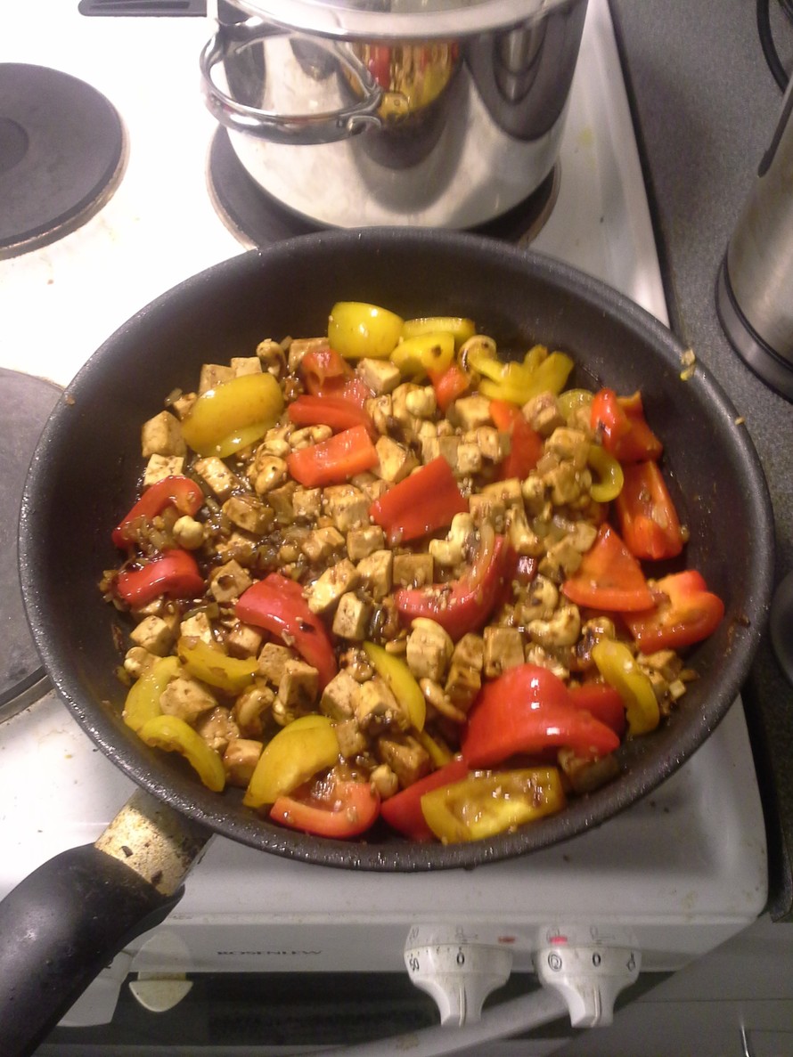 - Lisää paprikat ja paista kunnes paprikoihin on tullut vähän väriä ja ovat aavistuksen pehmenneet. Paprikoista ei ole tarkoitus tulla läpikypsiä. Lisää sitten sipulin vihreät osat, pähkinät ja kastike.
