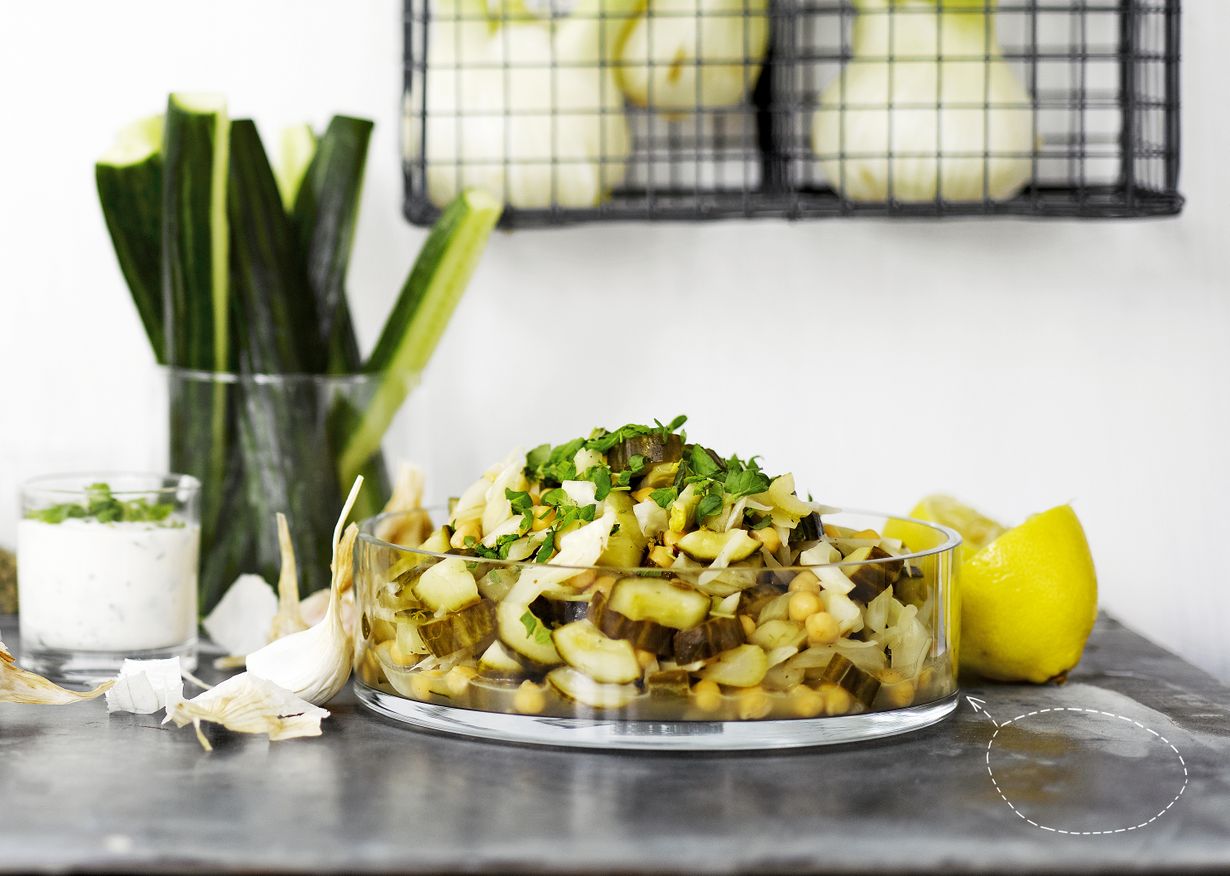 - Kuumenna öljy vokkipannussa tai laakeassa kattilassa. Lisää kurkut, fenkoli, valkosipuli ja fenkolinsiemenet. Kuullota 5 minuuttia kahdella lastalla nostellen. Valuta kikherneet, lisää ne vokkiin ja kuumenna. Mausta sitruunalla, suolalla, pippurilla ja mintulla.