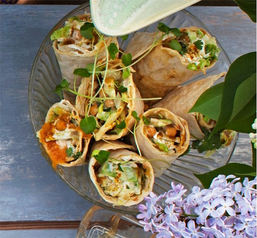 - Kokoa rullat. Pane pohjalle kaalisilppua, lusikoi päälle ranskankermaaja kikherneseosta. Mausta mangochutneylla, rullaa ja nauti.