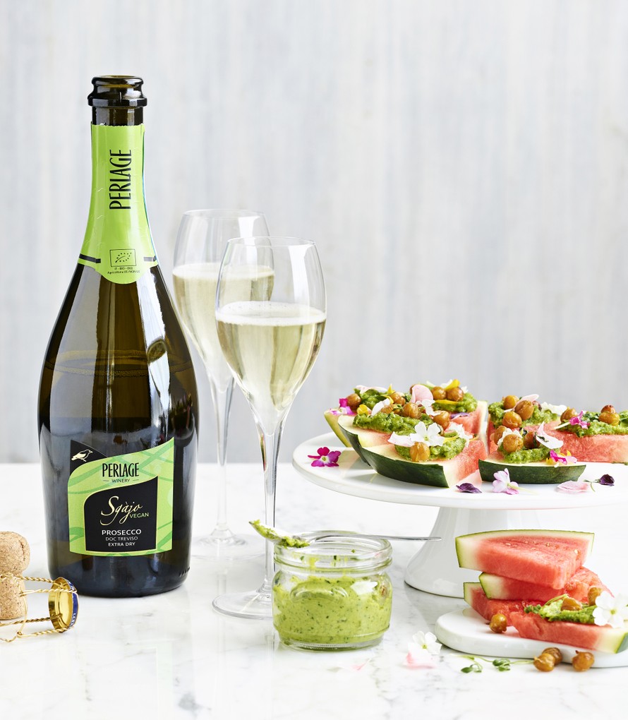 Raikkaan makea vesimeloni, yrttinen pesto ja mausteisen rapeat kikherneet ovat uskomattoman hyvä yhdistelmä! Valitse suupalojen kanssa juomaksi ylellinen ja vegaanisertifioitu luomuprosecco.