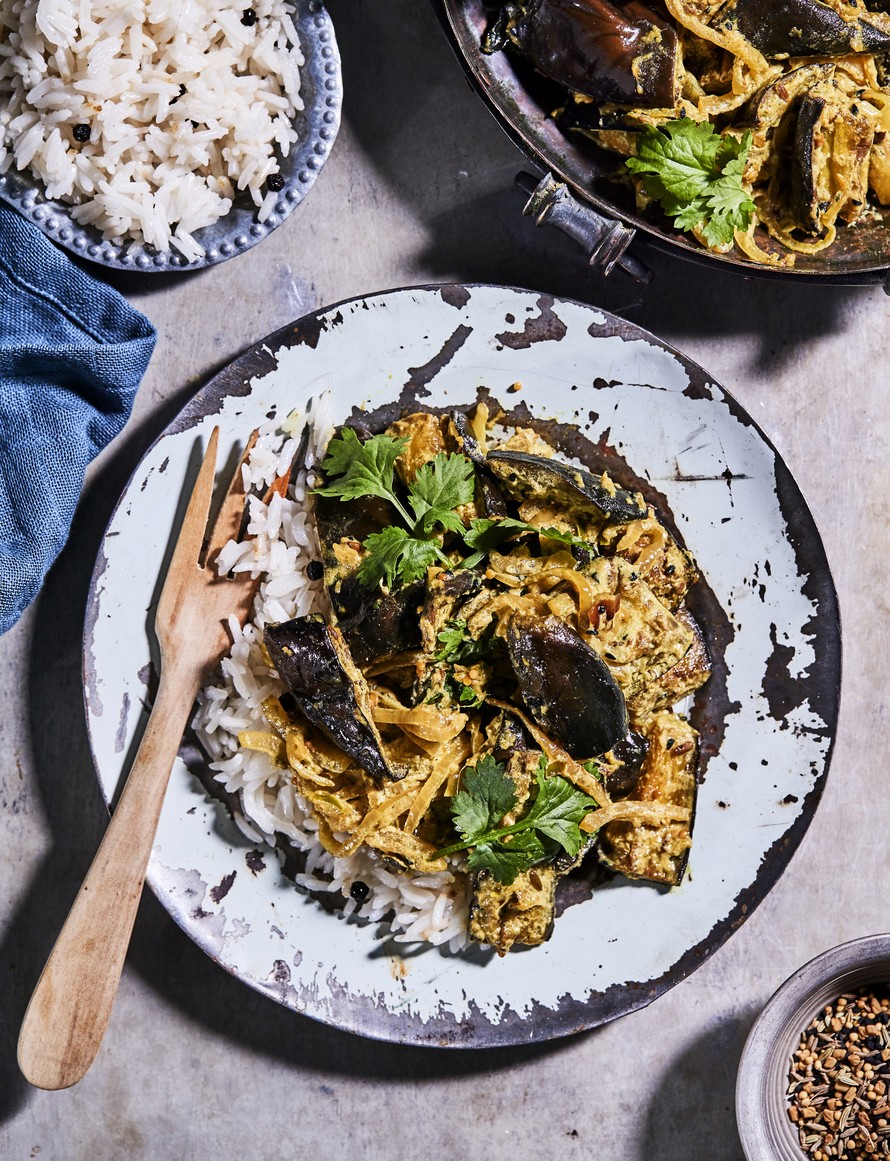 Kääntele munakoisot kastikkeen joukkoon ja anna kastikkeen hautua 5 minuuttia. Hienonna korianteri päälle. Tarjoa curry riisin kanssa.