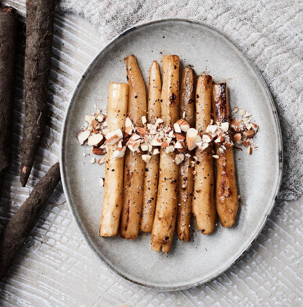 Köyhän miehen parsaksi kutsutun mustajuuren maku pääsee kunniaan, kun keität sitä ensin mausteliemessä. Voissa paistamisen ansiosta mustajuuri saa kauniin kullanruskean pinnan.