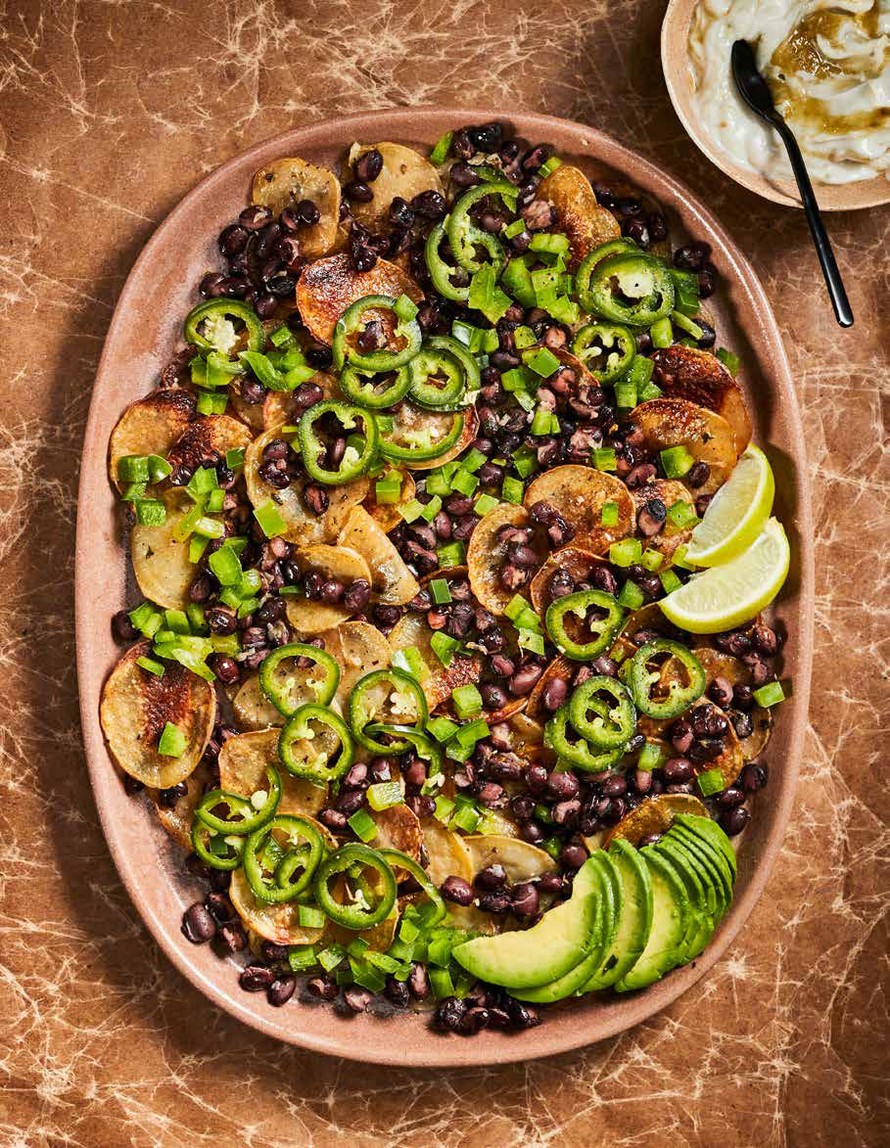 Mahtavan hyvä viikonloppuruoka valmistuu nachopellin tapaan mutta ohuiksi viipaloiduista perunoista. Valkosipulilla maustetut mustapavut sopivat paahtumaan perunoiden kanssa samalle pellille. Pikkelöity jalapeno varmistaa tulisuuden!