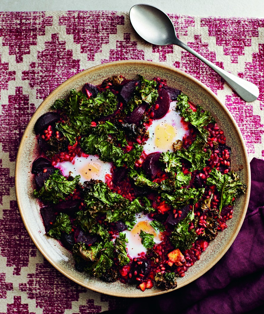 Hitaasti hautunut ohra-punajuurivuoka saa viimeistelyn lehtikaalilla ja kananmunilla. Ohran sisältämä beetaglukaani alentaa tutkitusti kolesterolia.