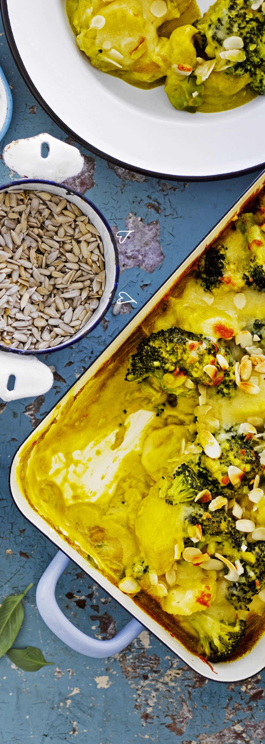 - Kaada kastike tasaisesti kasvisten päälle. Ripottele juustoraaste pintaan ja päällimmäiseksi mantelilastut. Gratinoi uunissa 10 minuuttia.