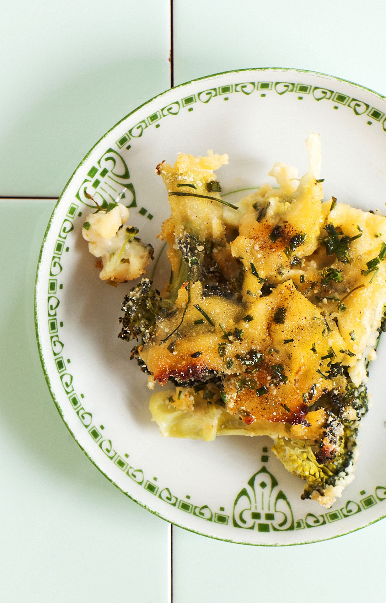 - Kaada päälle juustoseos ja pane vuoka uunin keskitasolle 225 asteeseen noin 10 minuutiksi, kunnes pinta on saanut kauniin paistovärin. Tarjoa kasvisruokana tai aterialla lisäkkeenä.