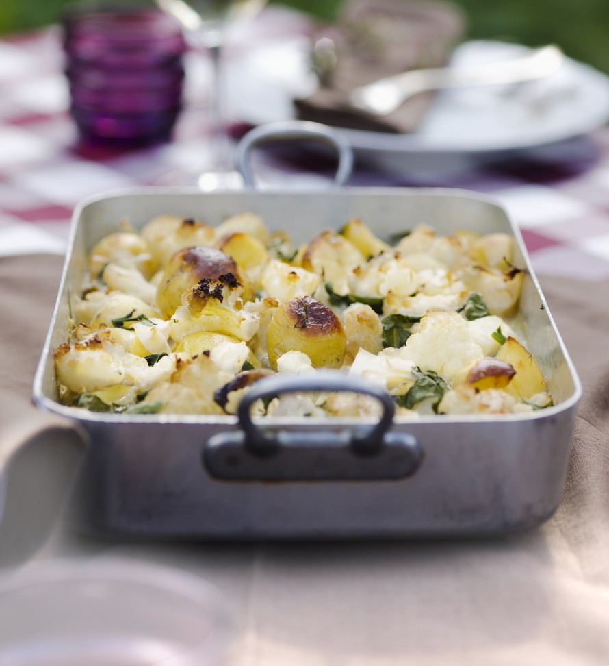 - Lohko keitetyt uudet perunat reiluiksi paloiksi. Irrota kukkakaali pieniksi nupuiksi ja höyrytä ne napakan kypsiksi.