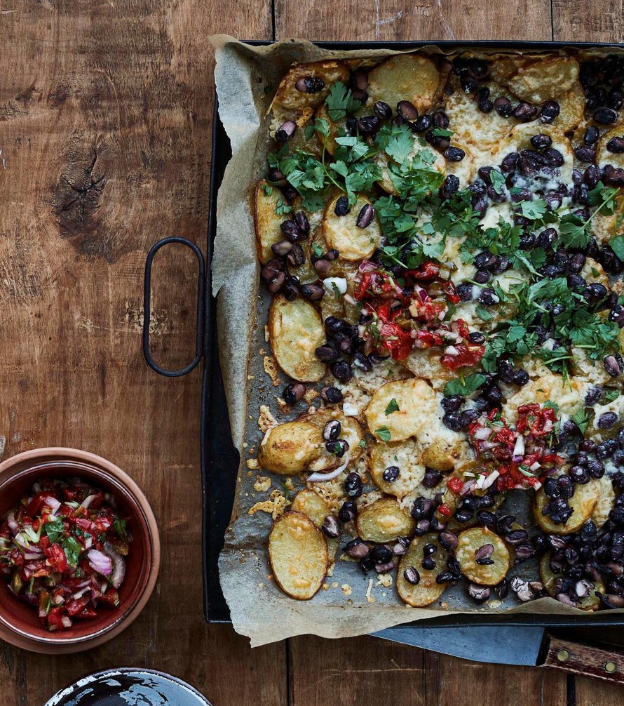 Valmista perjantai-illan nimikkoruoka vaihteeksi perunoista! Savupaprikaöljy, cheddarjuusto ja paprikasalsa tekevät perunanachopellistä koukuttavan hyvän.