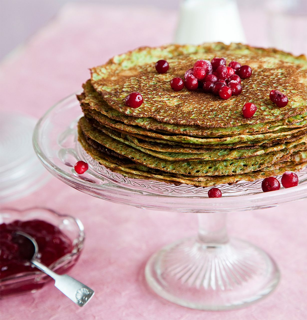 Tarjoa pinaattiletut sokeroitujen pakastepuolukoiden tai puolukkahillon kanssa.