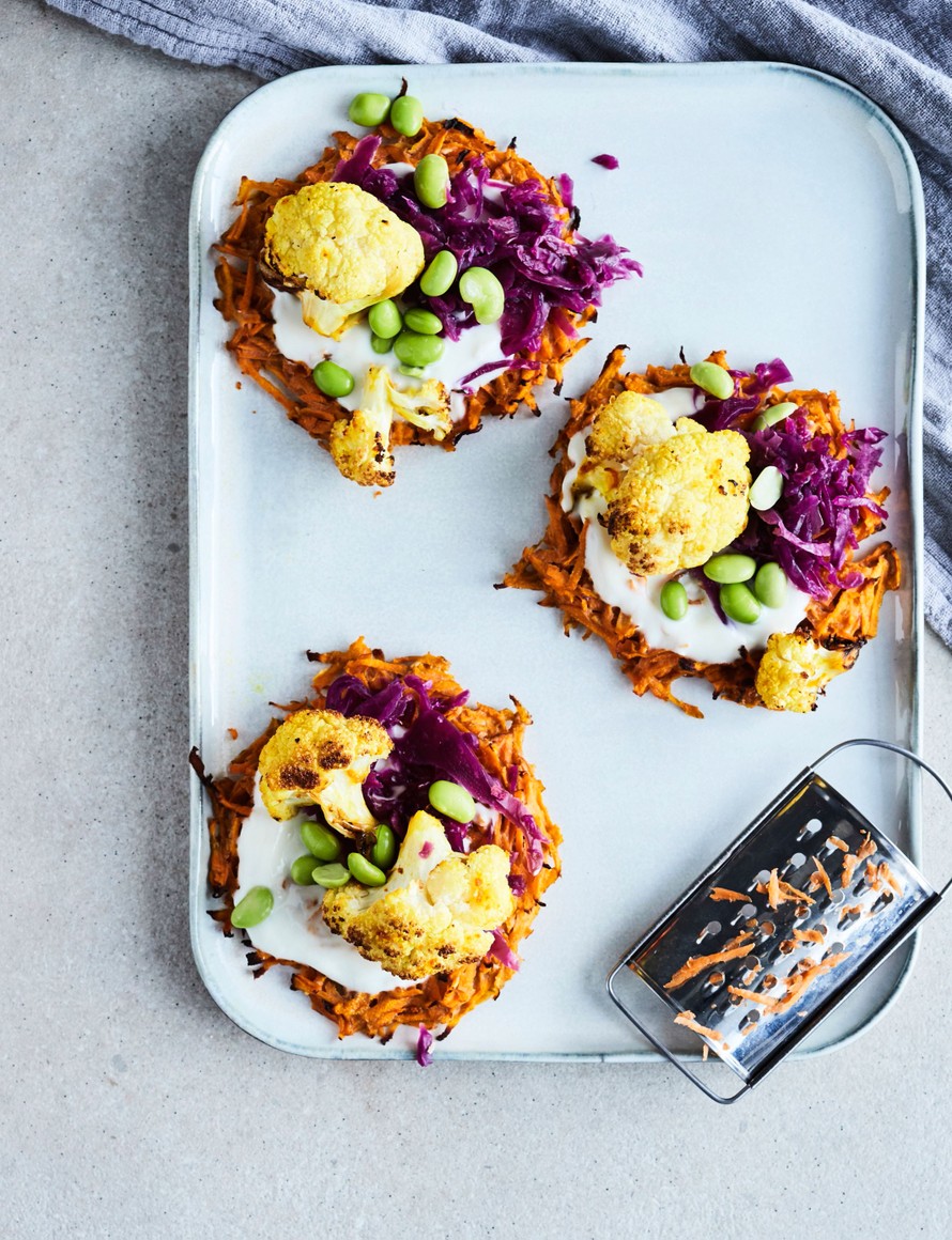 Tacoja porkkanaraasteesta? Kyllä! Lastaa uunissa paahdetut helpot porkkanatacot kurkuma-kukkakaaleilla, soijapavuilla ja hapankaalilla.