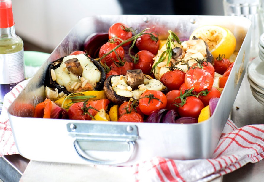 - Leikkaa valutettu halloumi ohuiksi siivuiksi ja asettele siivut täytettyjen herkkusienten päälle uunivuokaan. Lisää vuokaan kirsikkatomaatit, pilkotut kesäkurpitsat ja paprika sekä kuoritut ja lohkotut punasipulit.