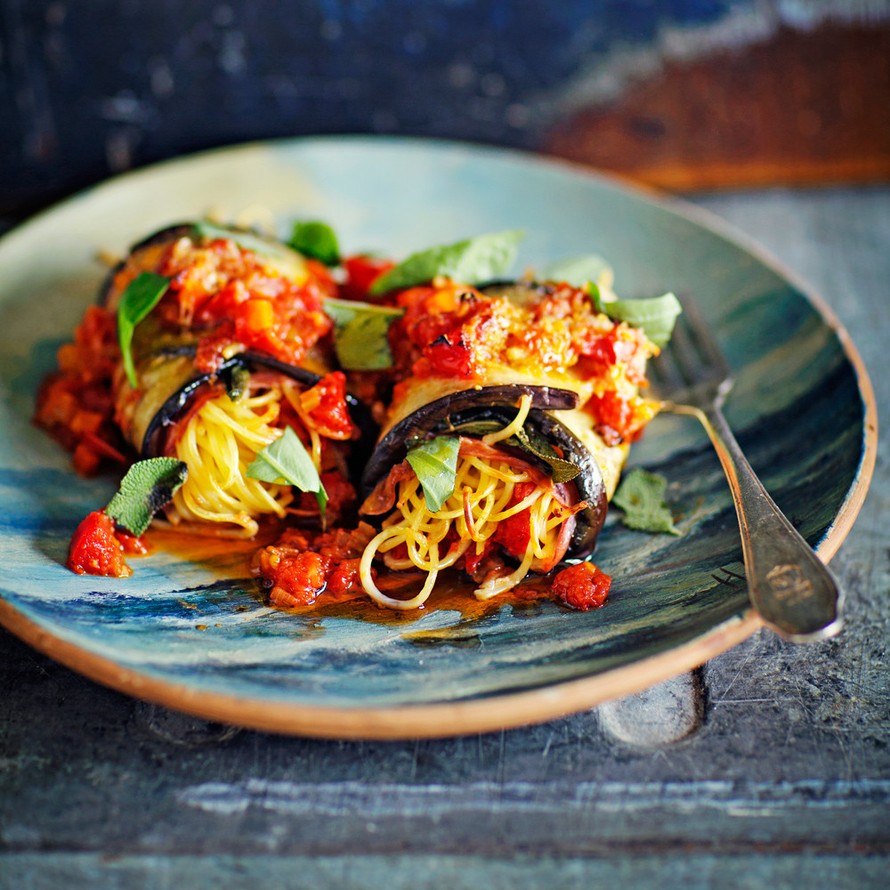 Italialaiset munakoisorullat hautuvat uunissa kastikkeen alla.