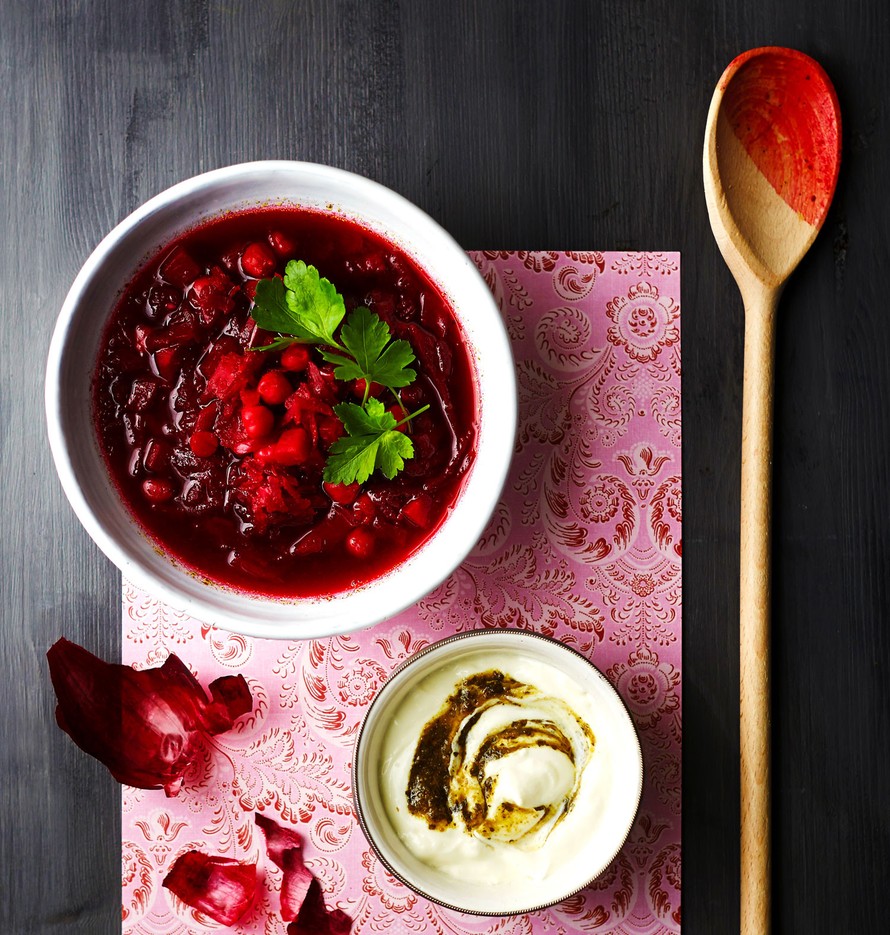 Venäläinen borssi ja pohjoisafrikkalaisella harissalla maustettu jogurtti ovat yllättävän maukas yhdistelmä.