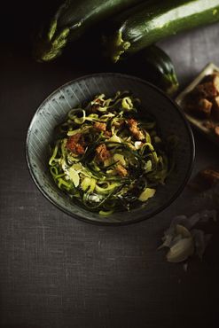 Kesäkurpitsanauhat ja pinaattikastike