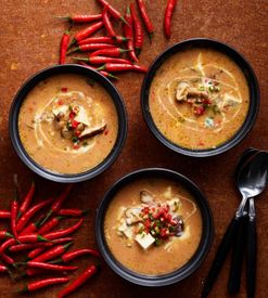 Paahdettua bataattia, mausteisia kikherneitä ja kurkumahummusta