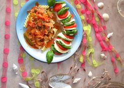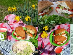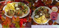 Täytetyt sienet vihreällä pestolla sekä munakoiso perunasalaattilla, ranskiksilla että kasvisbruchetoilla Jaana tuulee lisäsi reseptin