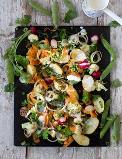 Possunnoisetit, salaattitahna ja basilika-perunasalaatti