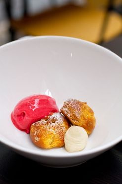 Sinnen tuulihattu, laku-valkosuklaamoussea ja vadelmasorbettia