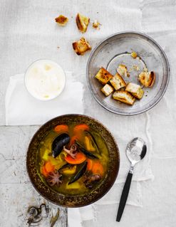 Mausteinen äyriäiskeitto ja cayennekrutongit