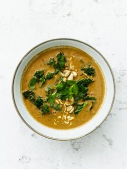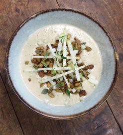 Karamellisoitu sipulikeitto ja pähkinä-siemenpaistos