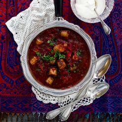Borssikeitto, rapeaa pekonia ja yrttismetanaa