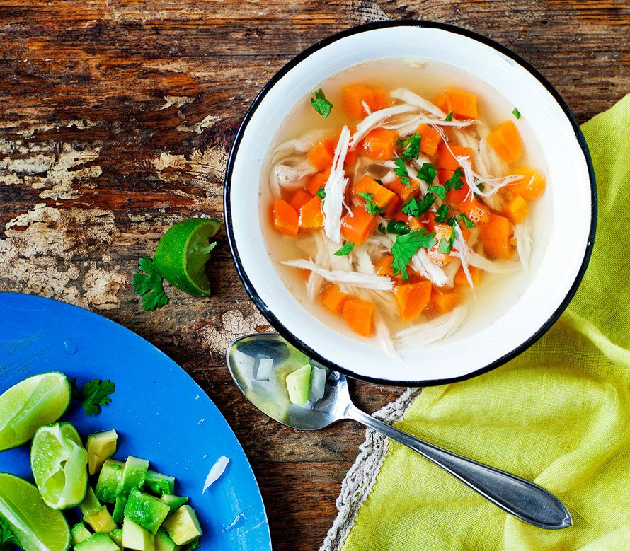 - Laita keitto tarjolle. Kuumenna kanaliemi matalalla lämmöllä. Tarkista maku, halutessasi lisää suolaa. Jaa kanaa ja porkkanakuutioita annoskulhojen pohjalle ja kaada kuuma kanaliemi päälle. Tarjoa lämpimien tortillojen kanssa.