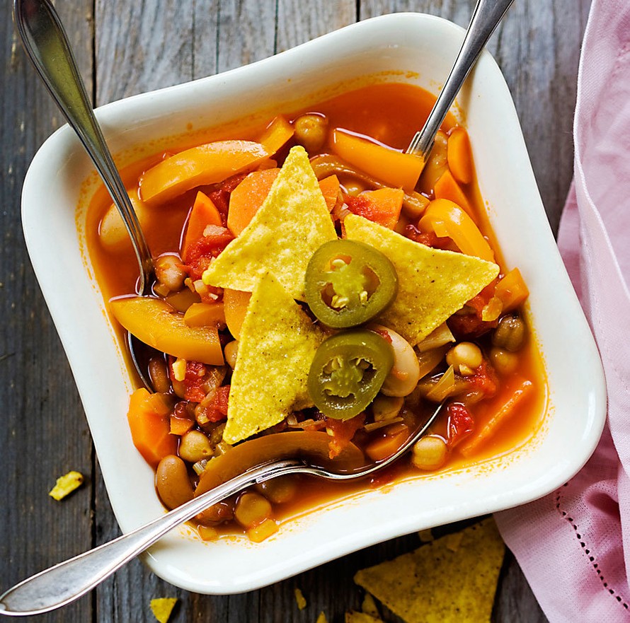 - Kuori ja hienonna sipuli ja valkosipulinkynnet. Leikkaa porkkanat, paprikat ja selleri viipaleiksi. Kuumenna öljy kattilassa ja kuullota siinä sipuleita, porkkanaa ja selleriä 3–5 minuuttia. Lisää paprikat, tomaattimurska ja kasvisliemi. Keitä 10 minuuttia. Lisää pavut ja kuumenna. Koristele keitto jalapenoviipaleilla ja tortillasipseillä.