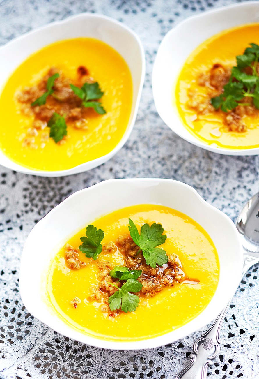- Sekoita sahrami puoleen desiin lämmintä vettä. Lisää koko vesimäärä kattilaan, myös sahramivesi. Hauduta keittoa 25 minuuttia eli kunnes kasvikset ovat pehmeitä. Soseuta keitto.