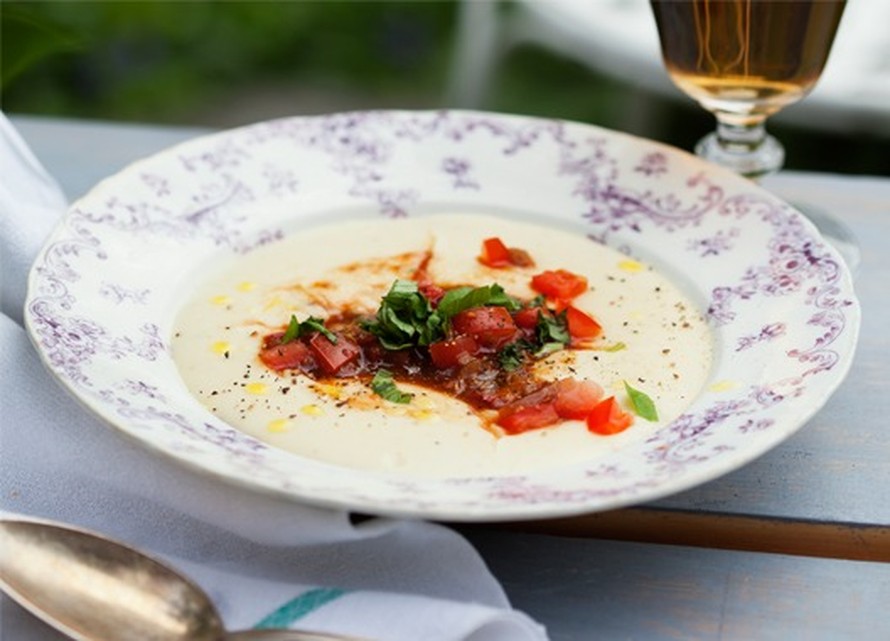 - Valmista keitto. Paahda mantelit ja pinjansiemenet kevyesti leivinpaperin päällä 200-asteisessa uunissa ja hienonna tasaiseksi monitoimikoneessa. Lisää vesitilkassa pehmeäksi liotettu leipä, murskatut valkosipulinkynnet, öljy, murennettu puolikas kanaliemikuutio ja vesi pikkuhiljaa koneen käydessä. Mausta suolalla ja sherryviinietikalla.