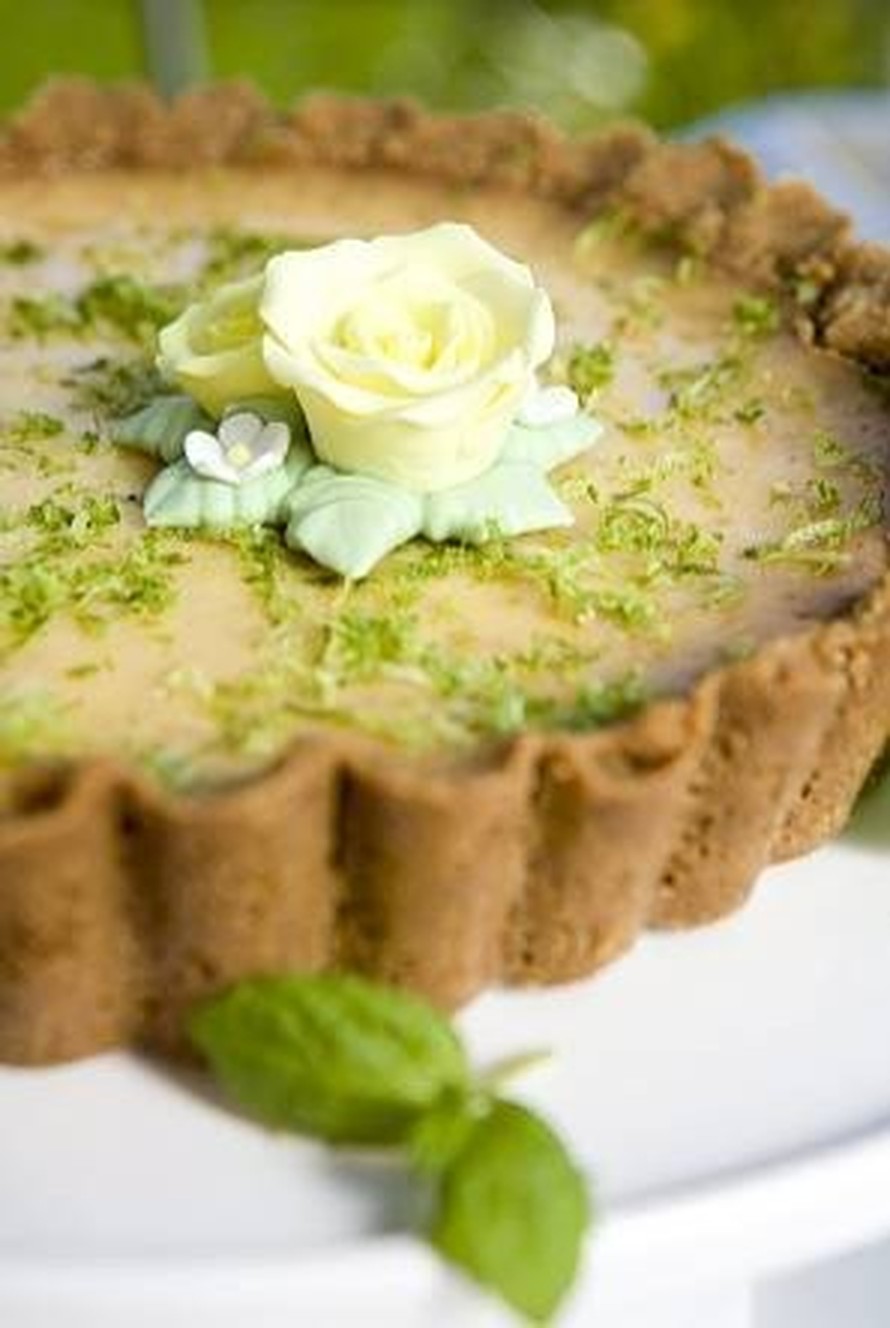Vatkaa keltuaisia kulhossa sähkövatkaimella, kunnes ne muuttuvat kuohkeammiksi. Lisää tiivistemaito ja vatkaa edelleen, kunnes seoksesta tulee vaahtoa. Lisää limettimehu ja -kuoriraaste. Sekoita hyvin. Kaada seos esipaistetun pohjan päälle