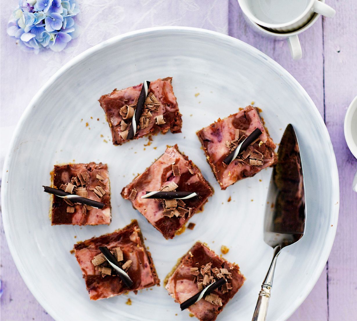 - Koristele raastetulla suklaalla ja suklaakoristeilla. Halutessasi voit tarjota palojen kanssa tuoreita kirsikoita.
