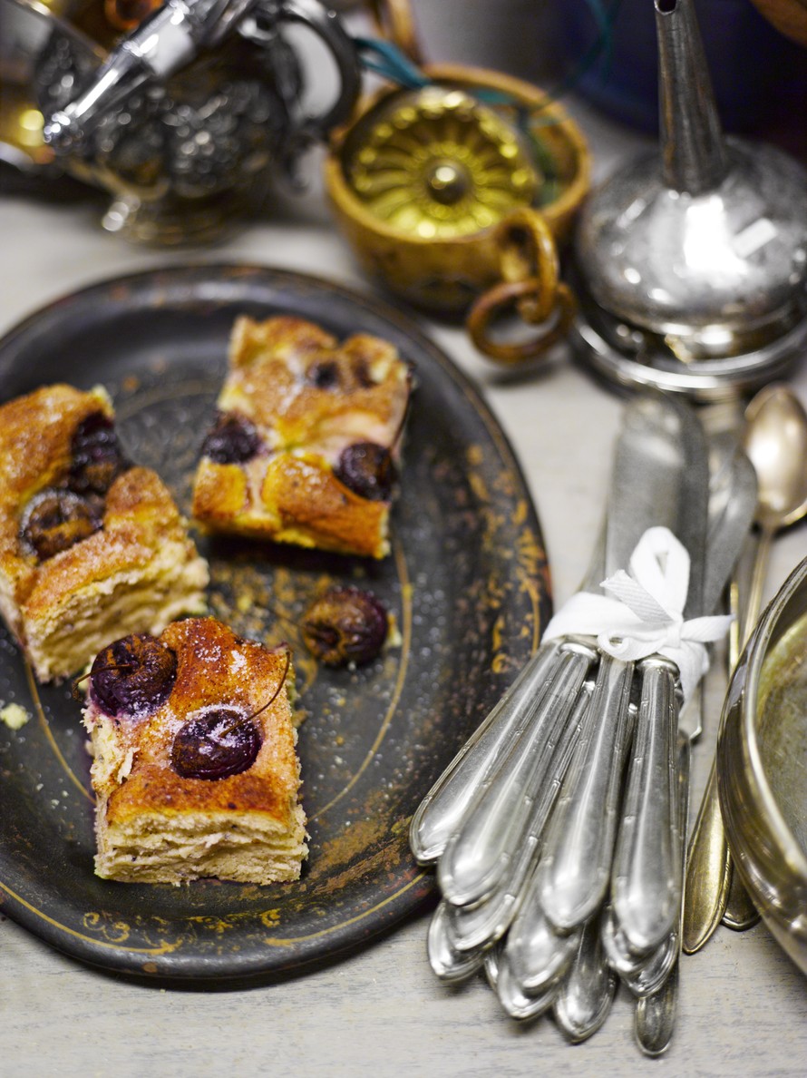 Muhkean, reilusti kardemummalla maustetun pannupullan ulkonäkö muistuttaa italialaista focacciaa, mutta maku on ehtaa pullaa. Uunin lämmössä makeatkin kirsikat happamoituvat hieman, joten niiden päälle voi ripotella runsaan sokerihunnun.