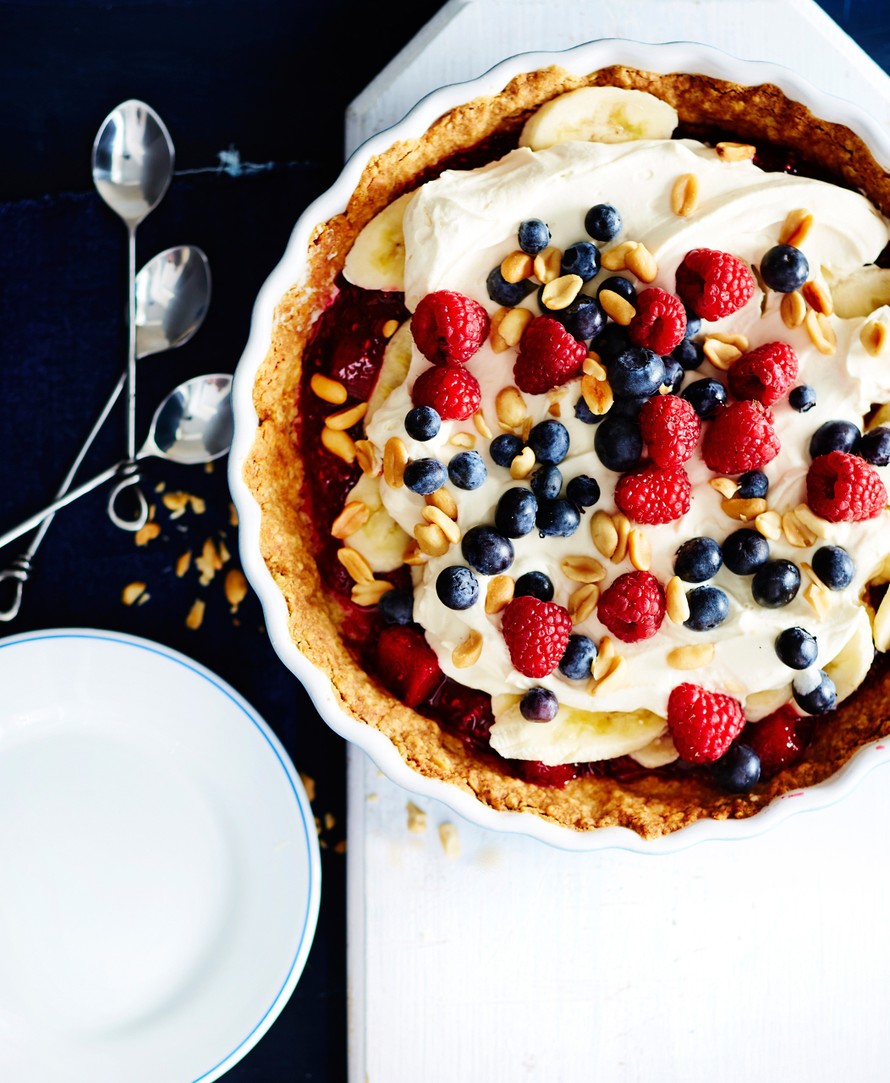 - Käytä koristeluun tuoreita vadelmia, mustikoita sekä suolapähkinöitä.