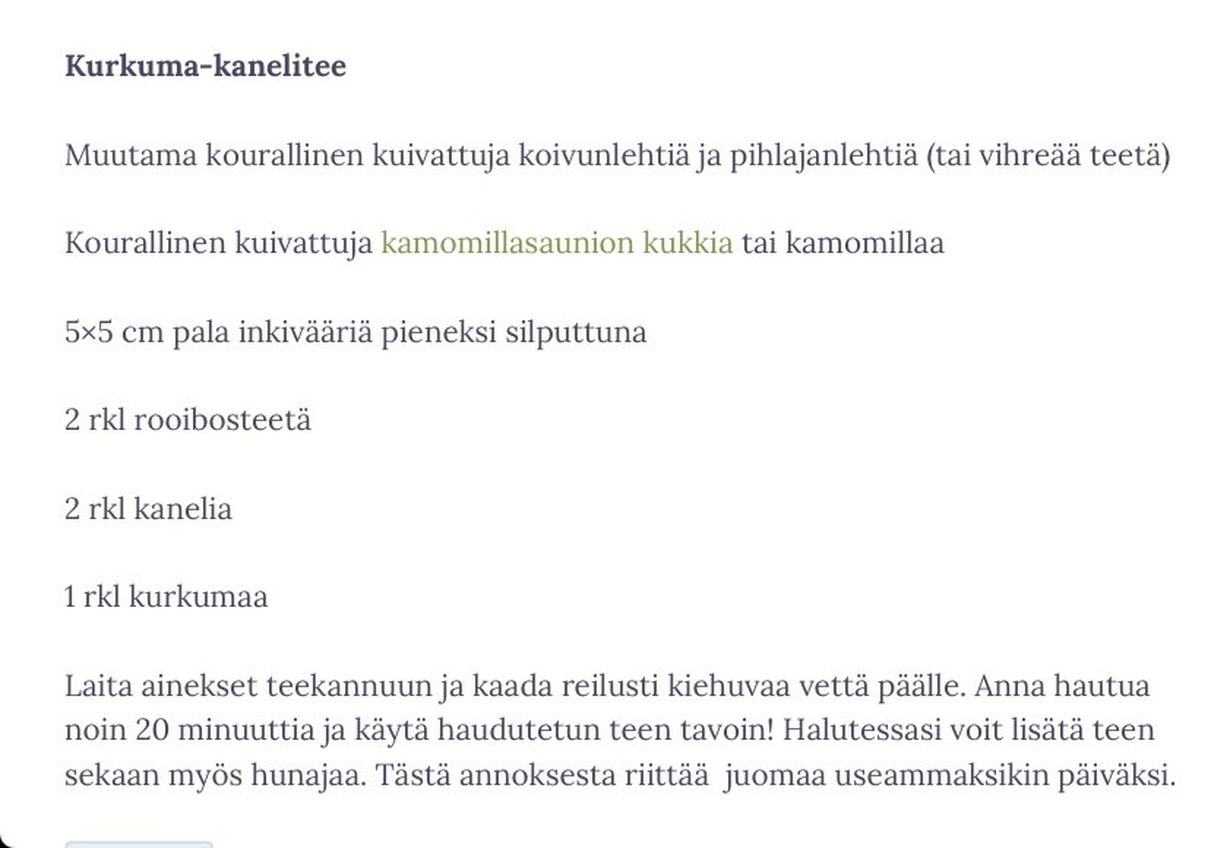 22:50 | 28.9.2014 Kurkumatee Lisää omaan keittokirjaan Inkku7634 on lisännyt 10 reseptiä Sisältö jatkuu mainoksen alla Sisältö jatkuu mainoksen alla Kurkumatee Lisää kokoelmaan Like 0 Ainesosat Vaiheet Tilaa Glorian ruoka & viini