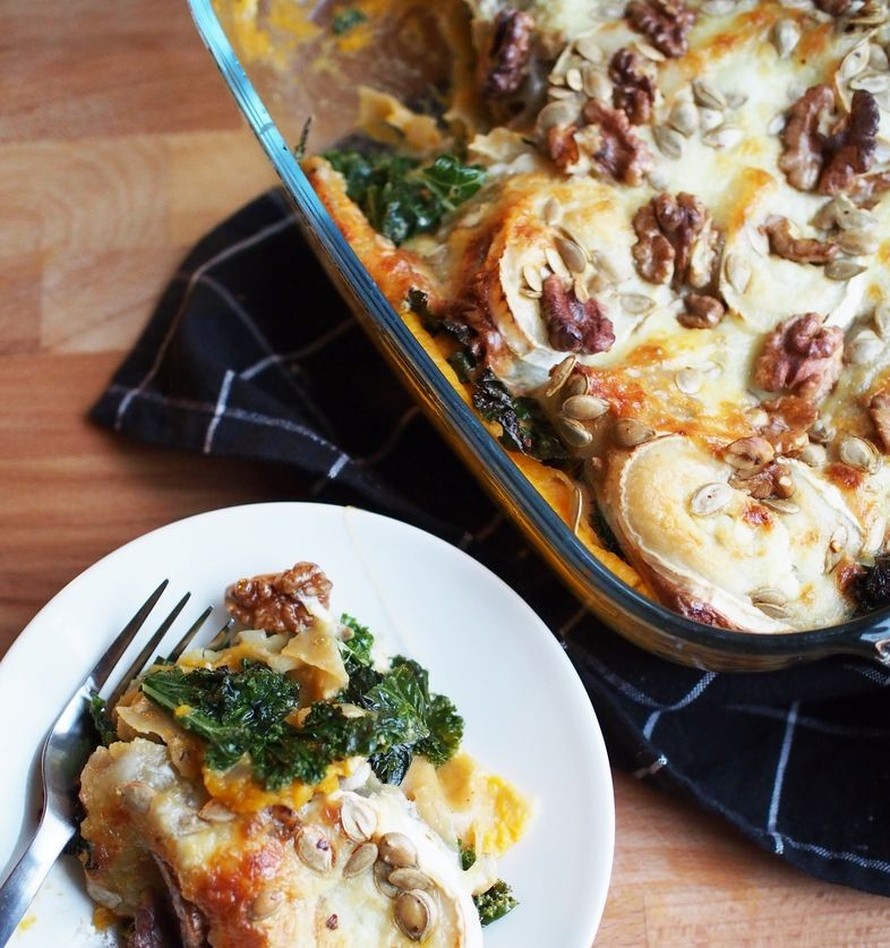 Viipaloi mozzarella ja loput vuohenjuustosta. Kokoa lasagne laittamalla lasagnelevyjä, kurpitsasosetta, lehtikaalia ja vuohenjuustoseosta kerroksittain vuokaan. Laita pinnalle mozzarella- ja vuohenjuustoviipaleet, pähkinät ja kurpitsansiemenet.