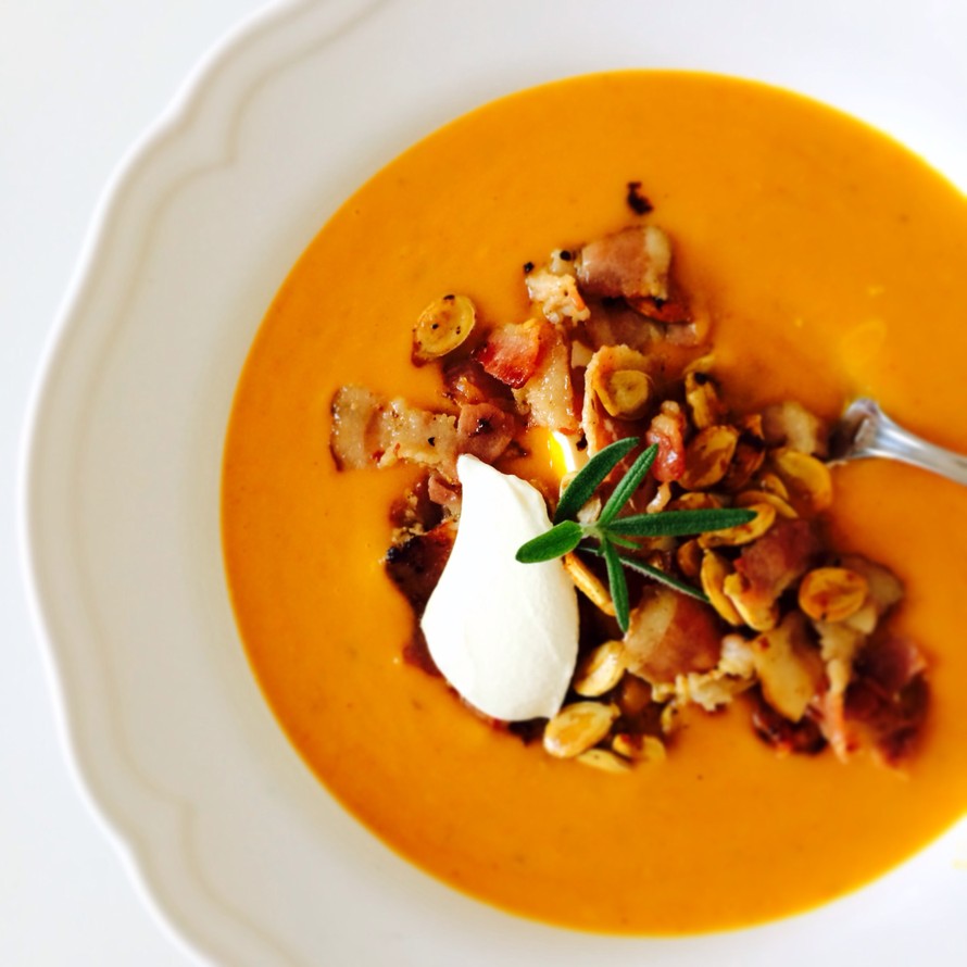Kurpitsakeitto & chili-pekoni maustetut kurpitsansiemenet