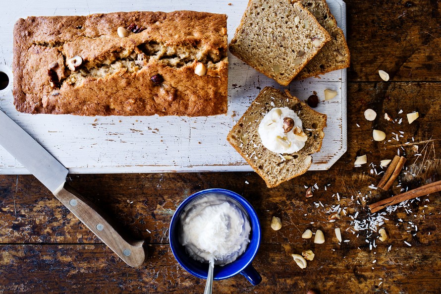 Herkullinen banaanileipä sopii niin brunssille, välipalaksi kuin kahvipöytäänkin. Kookoshiutaleilla maustettu hapatettu kermavaahto viimeistelee ihanan mehevän kakun.