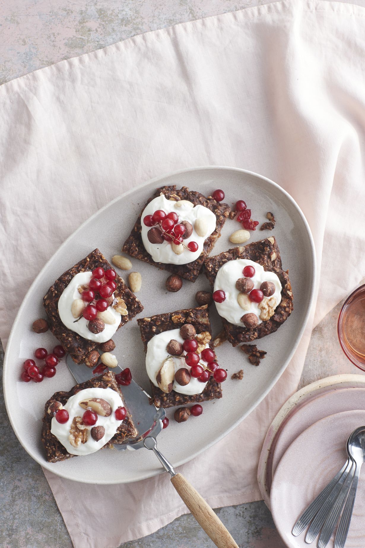 - Paloittele jäähtynyt paistos annospaloiksi. Notkista jugurtti. Lusikoi jugurttia palojen päälle. Koristele pähkinöillä ja marjoilla.