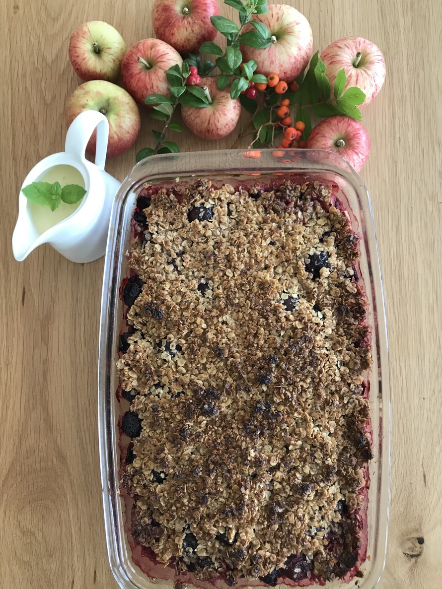 Tämä omenapaistos on aatelisoitu kirsikoilla ja siksi se onkin uskomattoman hyvää! Rapea kaurapinta kruunaa kokonaisuuden.