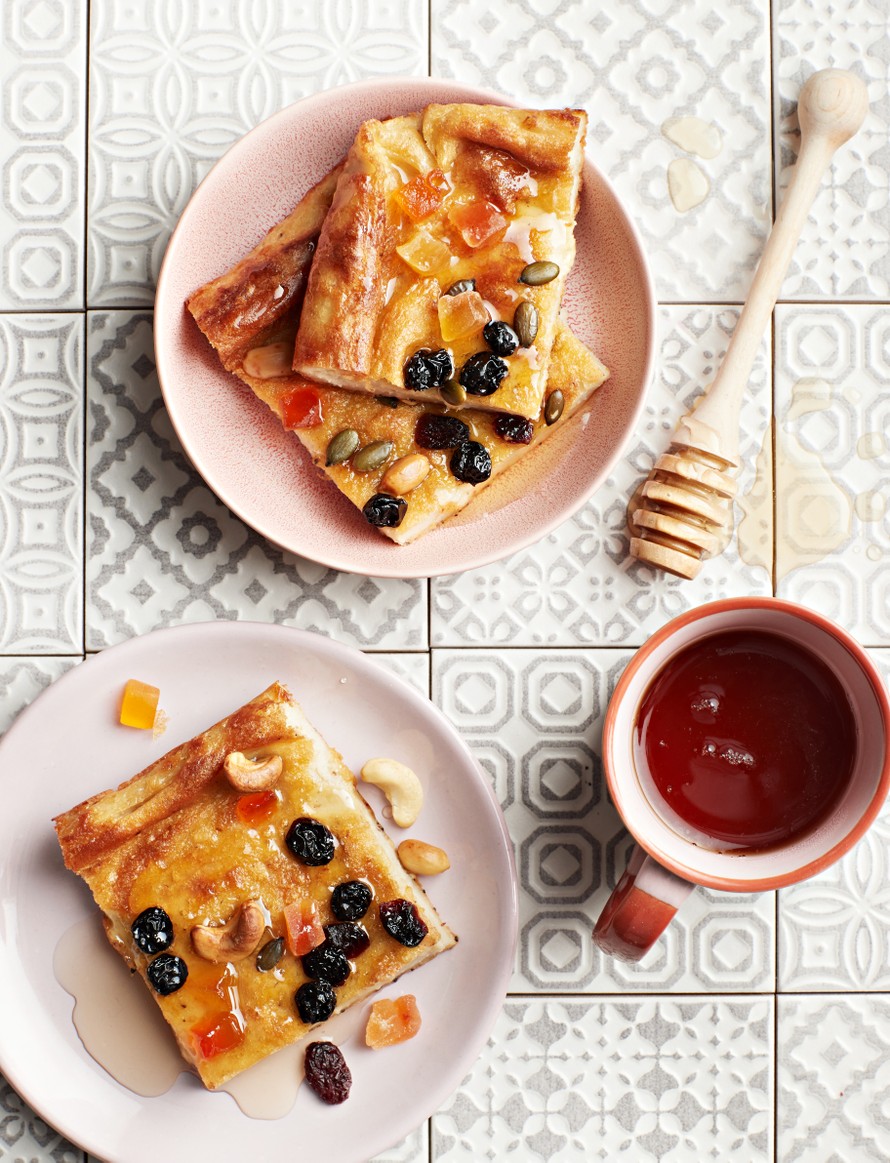 - Kaada taikina pellille. Paista uunissa 20 minuuttia. Lisää pinnalle pähkinäsekoitus ja jatka paistamista vielä 10 minuuttia.