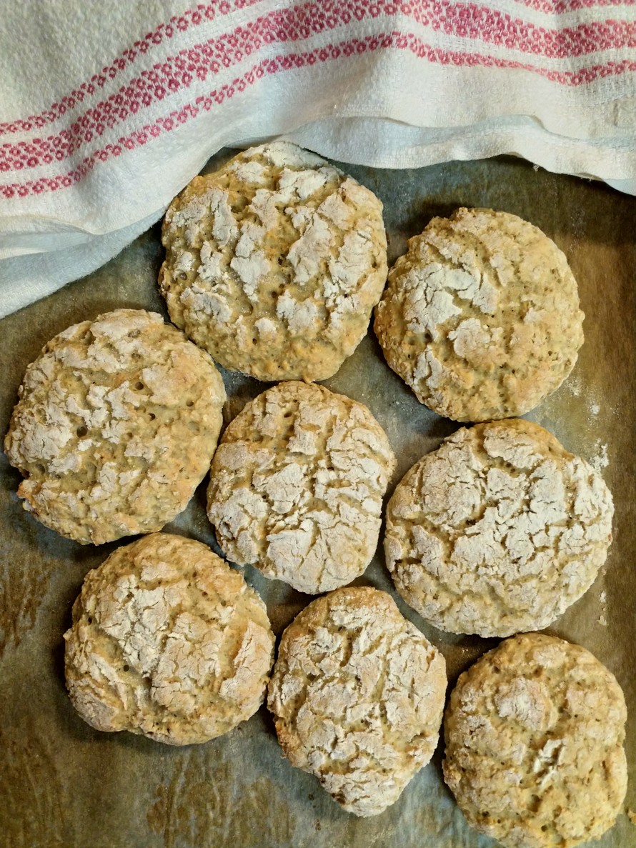 Nosta uunipellille leivinpaperin päälle kahdella ruokalusikalla kekoja n. 8 kpl ja laita jokaisen päälle vähän vehnäjauhoja ja muotoile leipäset pyöreiksi leipäsiksi, ei liian mataliksi. On helppo työvaihe.