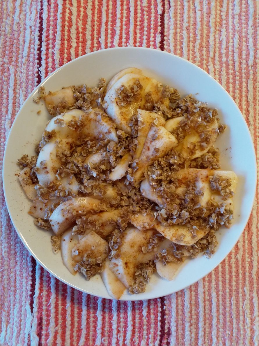 Laita kaurahiutaleiden sekaan fariinisokeri, hiven suolaa ja juokseva rasva ja sekoita ne muruksi ja lisää omenien päälle. Laita se sitten mikroon 1 min. täysillä ja kokeile ovatko omenan siivut pehmenneet ja anna sitten olla vielä 40 sekunttia ja kokeile välillä ovatko omenan siivut sopivan pehmeitä, voit vielä antaa olla vähän aikaa mikrossa jos haluat. Tämä on hyvää näinkin, mutta jos haluaa herkutella, niin syö jäätelön tai vaniljakastikkeen kanssa.