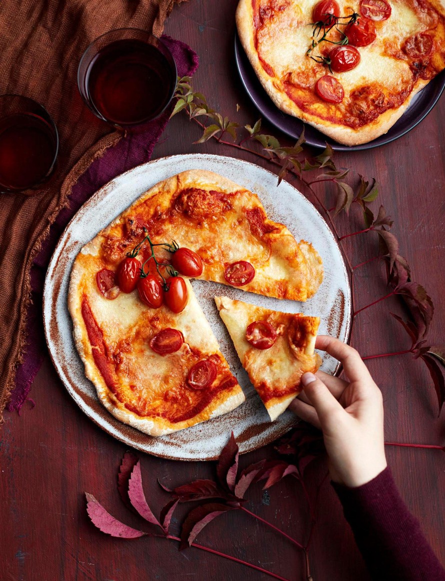 - Levitä pohjien päälle pizzakastiketta. Revi päälle mozzarellaa ja ripauta juustoraastetta. Halkaise kirsikkatomaatit ja lisää pizzojen päälle.