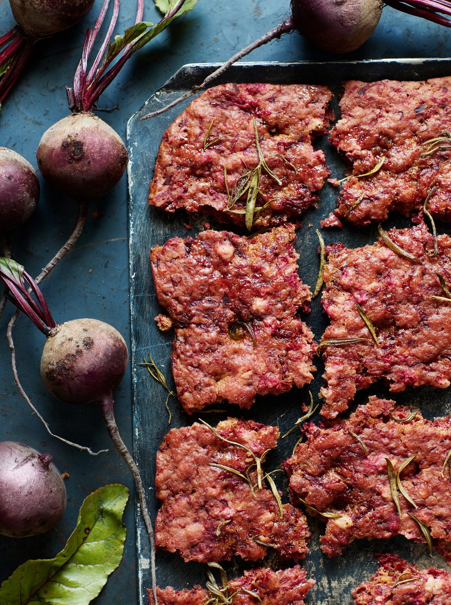 Tämä peltileipä muistuttaa hieman italialaista focacciaa, mutta punajuuri ja ruisjauhot tuovat leipään uutta makua.